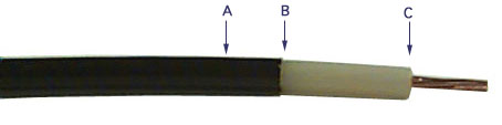 | The objective is to strip back the nylon jacket and polythene insulation to end up with the cable as shown below, whereupon a 54Super connector may be applied. |